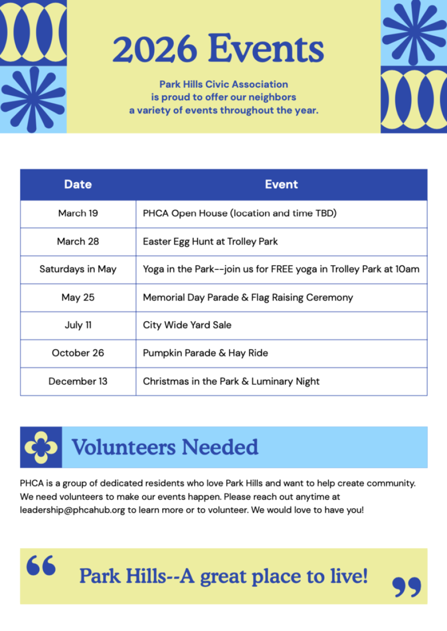 If you are interested in volunteering with the Park Hills Civic Association, please reach out to leadership@phcahub.org.